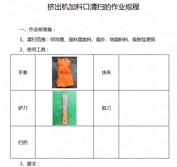 五、通過本次清掃的活動,和員工交流和討論,形成了加料口的清掃作業(yè)規(guī)程,作業(yè)規(guī)程共分:作業(yè)前準備、作業(yè)過程、作業(yè)后確認等三個步驟。