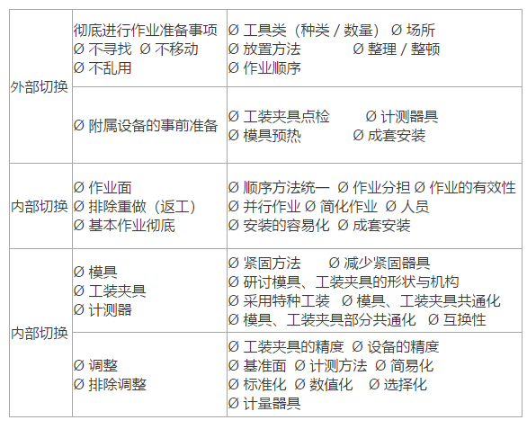 “一個流”生產(chǎn)的關(guān)鍵是如何縮短品種切換的時間。如表所示,為了縮短品種切換時間,就需要注意一系列的要點。對于外部切換,主要是要徹底進行作業(yè)準備和附屬設(shè)備的事前準備;對于內(nèi)部切換,則可以通過規(guī)范和簡化基本作業(yè)、標準化模具以及相應(yīng)的調(diào)整來縮短切換時間。