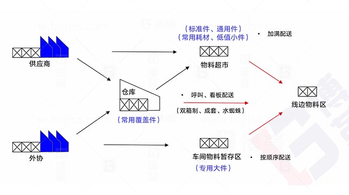 上海博革咨詢將協助您從簡單的推動式物流結構轉變為敏捷式物料配送系統。我們將根據不同的物料采購渠道,規劃設計3種車間物料存儲區域(物料暫存區、物料超市區、線邊物料區),并對這3種模式尋找和設計合適的配送方式(雙箱制、水蜘蛛模式、成套配送、直接上線)和包裝器具。