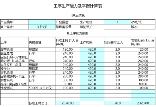 平衡率=【單件標準時間總和÷(瓶頸時間X工位總數)】×100%== 2320 ÷(300X11)X100%=70.30%