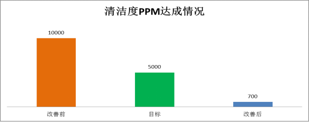 改善前:清潔度問題(焊后車鐵屑雜質、芯管組焊焊瘤、鍍后焊焊瘤、芯管試驗油液污染、鍍后去堵鐵屑)不良率高達10000PPM,經過項目改善,為700PPM,合計年收益約為24萬元,達成項目目標。