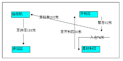 2.鈑金車間原材料至開料區50M,開料后運送至暫存 區物流距離62米