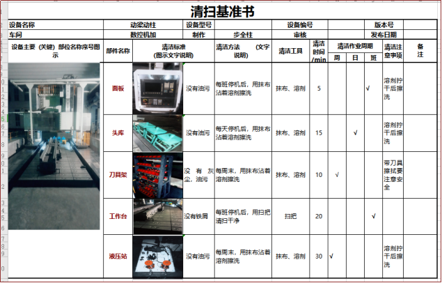 為打造標(biāo)準(zhǔn)化工廠,推動精益生產(chǎn),全員改善,需從6S項目開始,通過精益顧問的培訓(xùn)輔導(dǎo)和檢查,推進(jìn)了公司內(nèi)6S組織及職責(zé)建設(shè),打造并推廣了樣板車間,完成了單點教材OPL,設(shè)備六源分析和改善,建立了設(shè)備清掃基準(zhǔn)書及維持基準(zhǔn)卡,建立了6S周會及早會制度,完善了6S相關(guān)制度及手冊。