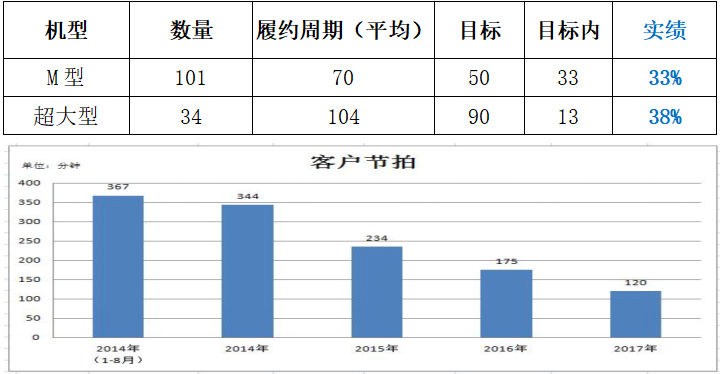 分析當前數(shù)據(jù),此兩款產(chǎn)品交付履約率分別為33%和38%,無法滿足客戶需求,且根據(jù)公司發(fā)展目標和客戶未來需求預(yù)測,未來4年,客戶生產(chǎn)節(jié)拍將由367分鐘降低至120分鐘,因此通過價值流分析,縮短產(chǎn)品交付周期提高訂單準時履約率成為迫切需要解決的一大問題。