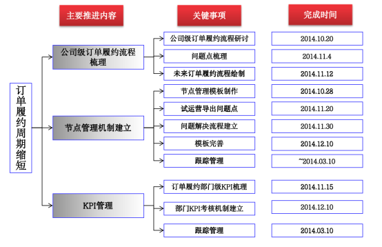 (3)制定項目進度跟蹤關(guān)鍵節(jié)點表,通過建立共同管理模版、各部門日常更新管理、日清會議協(xié)調(diào)機制,加強訂單履約過程目標管理。