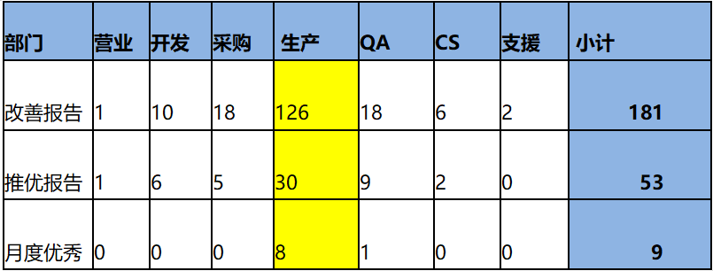 (2)完成各類改善共計181項,革新推優(yōu)53項,月度評比優(yōu)秀改善9項。