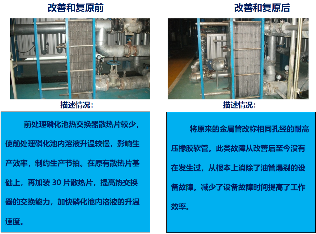 通過改善使前處理的生產效率提高了,以每輛車節約20秒的磷化時間,全年生產4.2萬輛車計算,全年可減少開機時間:42000*15/(60*60)=175小時,前處理每小時能耗850元,每人每小時12元工資,前處理班組25人,則全年可為公司節約: (850+12*25)*175=201250元。