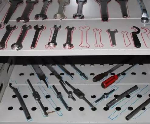 方法3:做成看板展示式或多層推拉式的展示板,下圖為看板展示式的展示板,所有的工具、零件都有固定的位置和標(biāo)識(shí),采用形跡管理的方式進(jìn)行管理,查找起來非常方便。